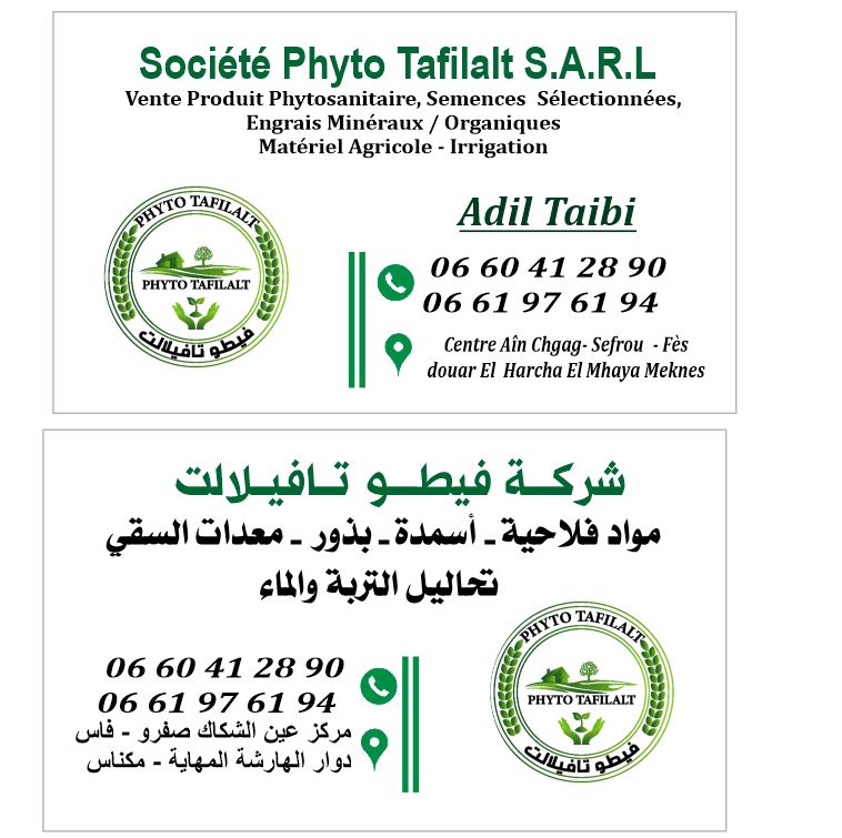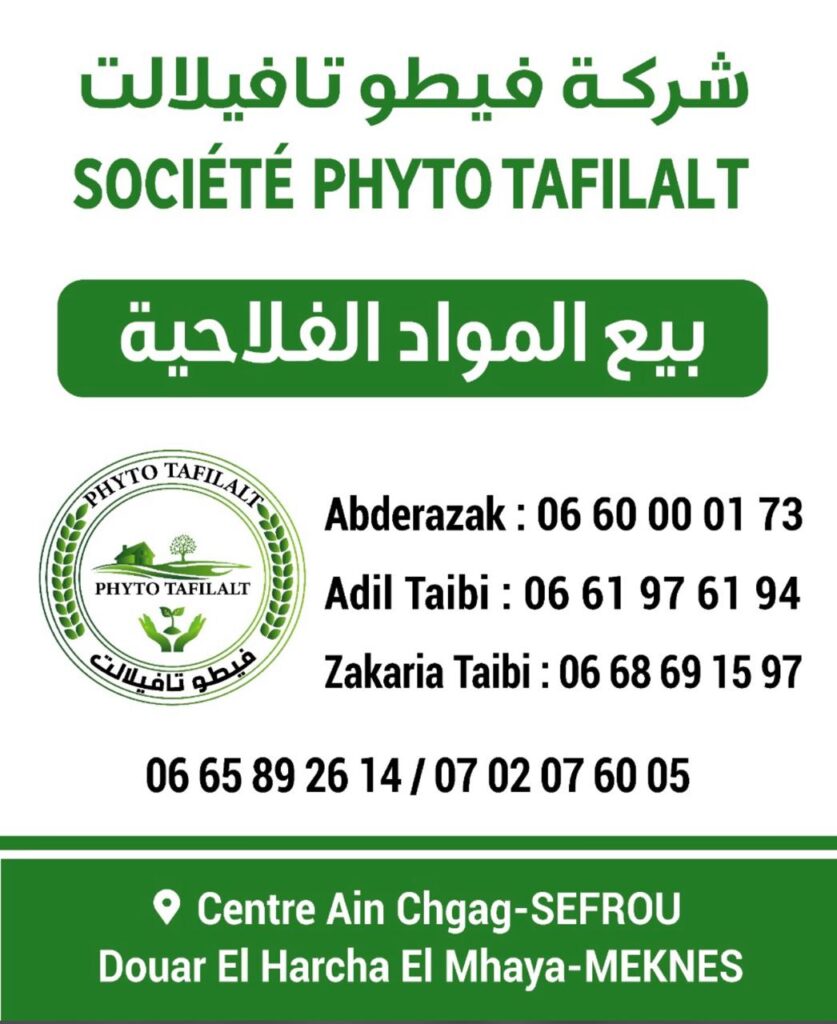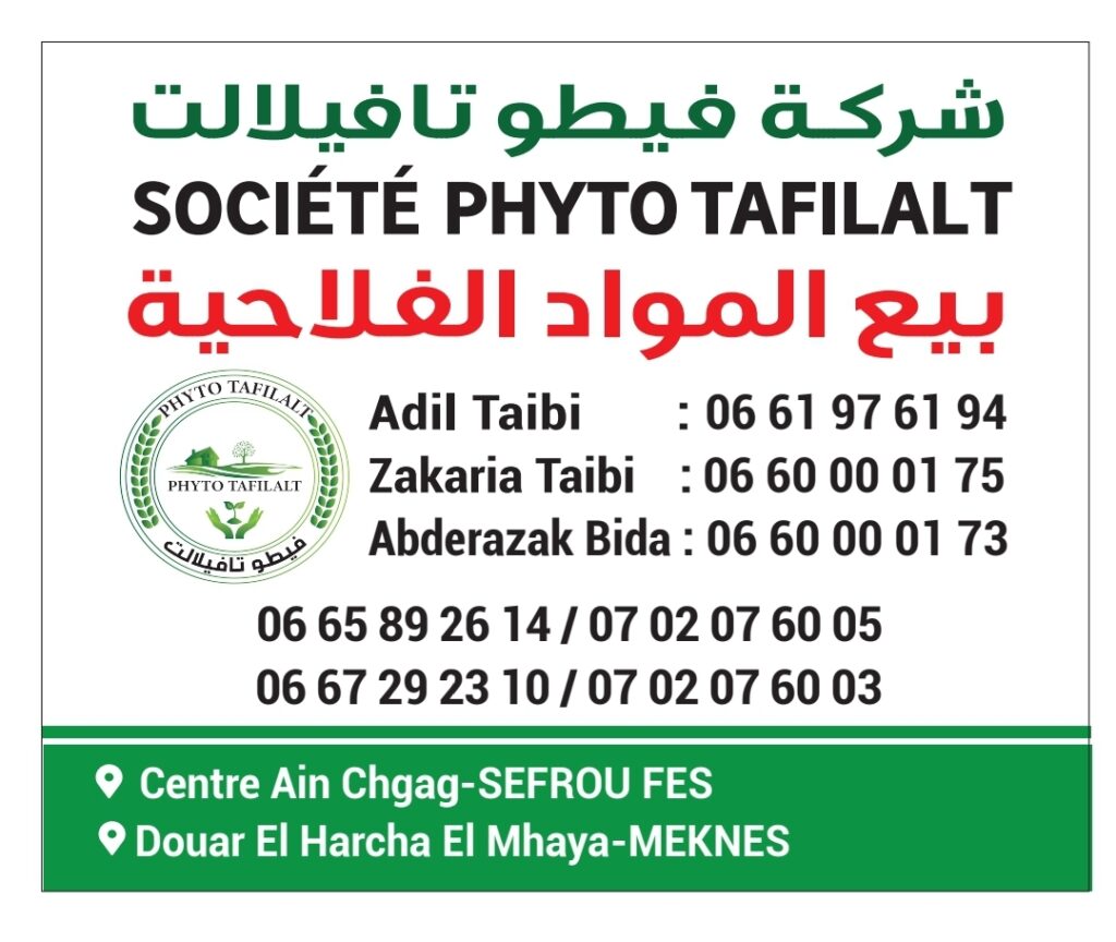Phyto Tafilalt est une entreprise spécialisée dans la commercialisation et la distribution de produits agricoles, notamment des phytosanitaires, des fertilisants, des semences ainsi que des matériels de traitement et d’apiculture. Notre siège est situé à Ain Cheggag, Sefrou, tandis que notre succursale se trouve à Lmhaya, Meknès. Les deux entités sont agréées par l’Office National de Sécurité Sanitaire des Produits Alimentaires (ONSA).